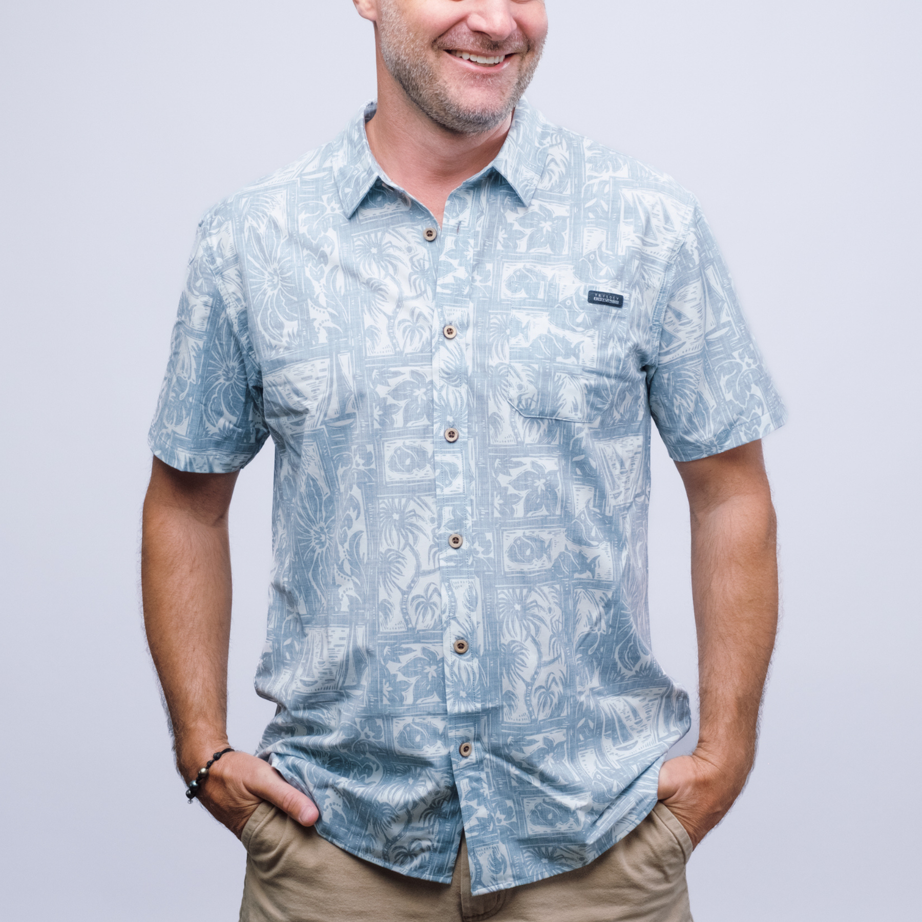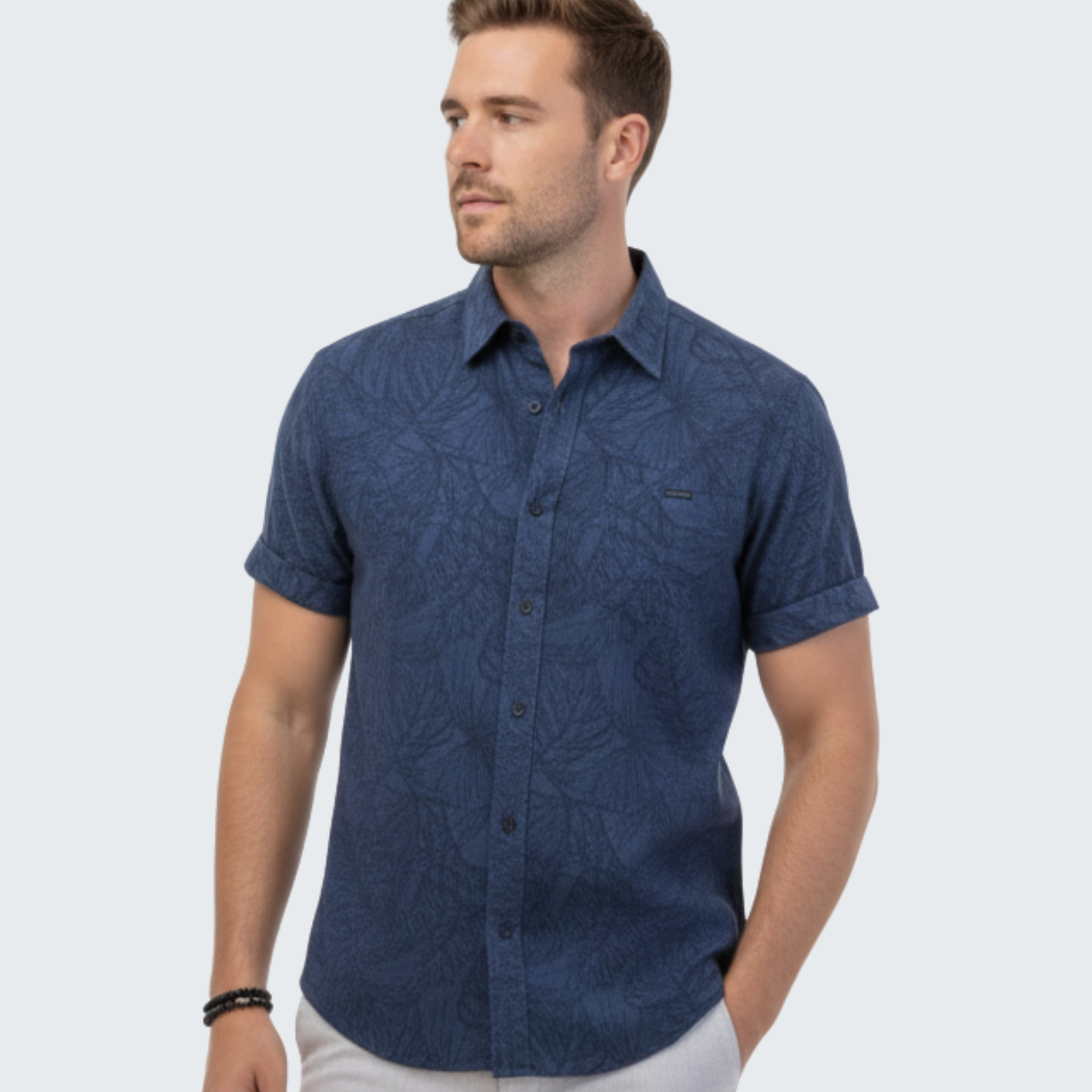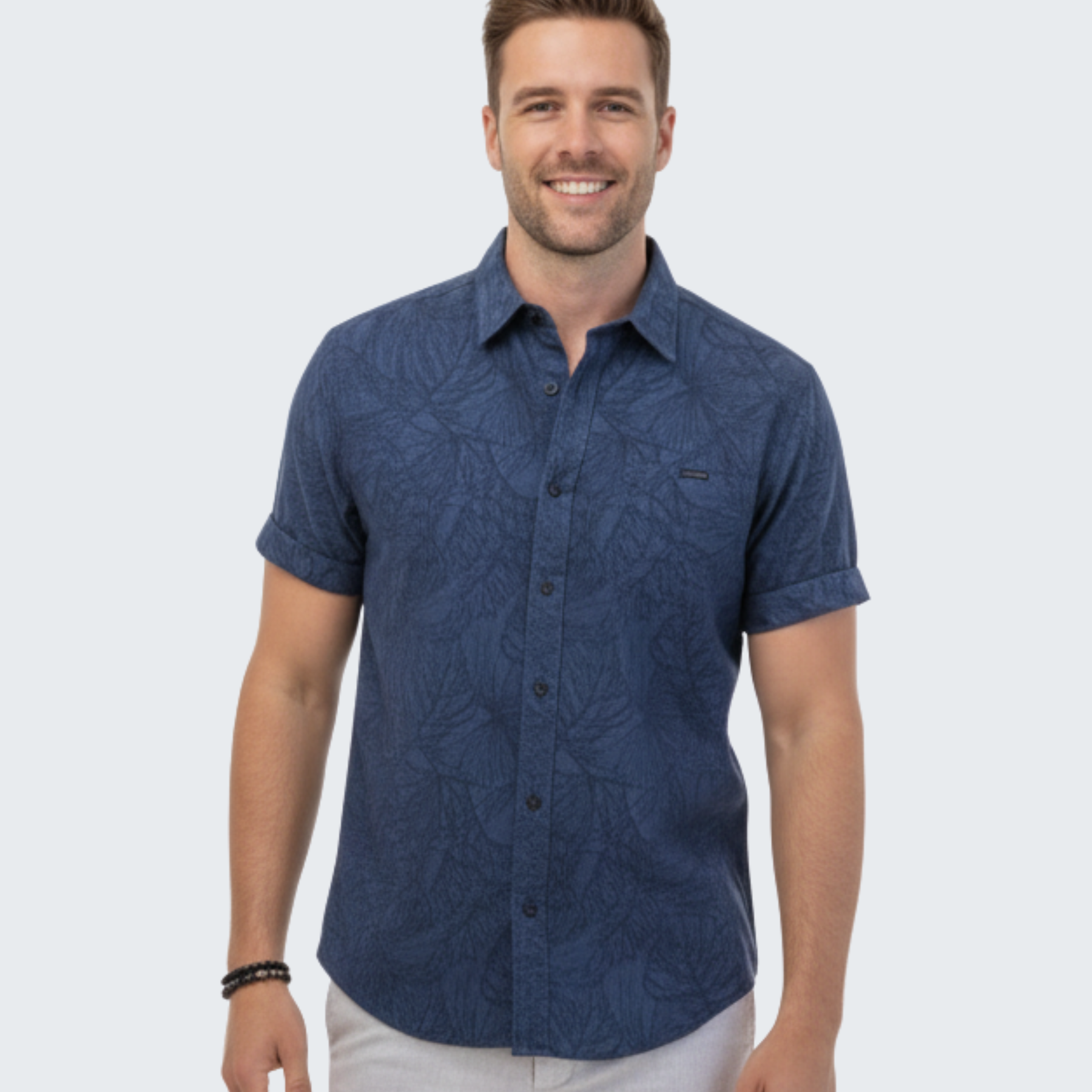 Stay cool and stylish with our Voyager Aloha Shirt, crafted from 98% cotton and 2% poly-stretch for soft, breathable comfort with a touch of stretch. Its tailored fit gives a clean, modern silhouette, while the navy base with subtle tropical accents keeps it versatile for beach days, vacations, or casual outings. Button-front design and easy care make it a practical, everyday go-to. This shirt combines comfort, style, and durability for all your warm-weather adventures.